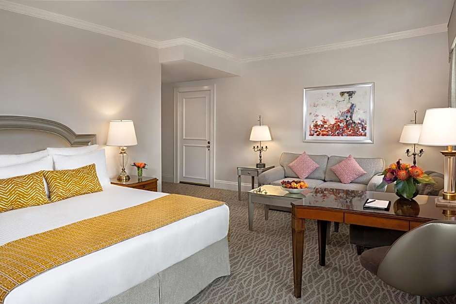 This room features extra seating, a work desk and chair. A flat-screen TV and marble tiled bathroom are also included.